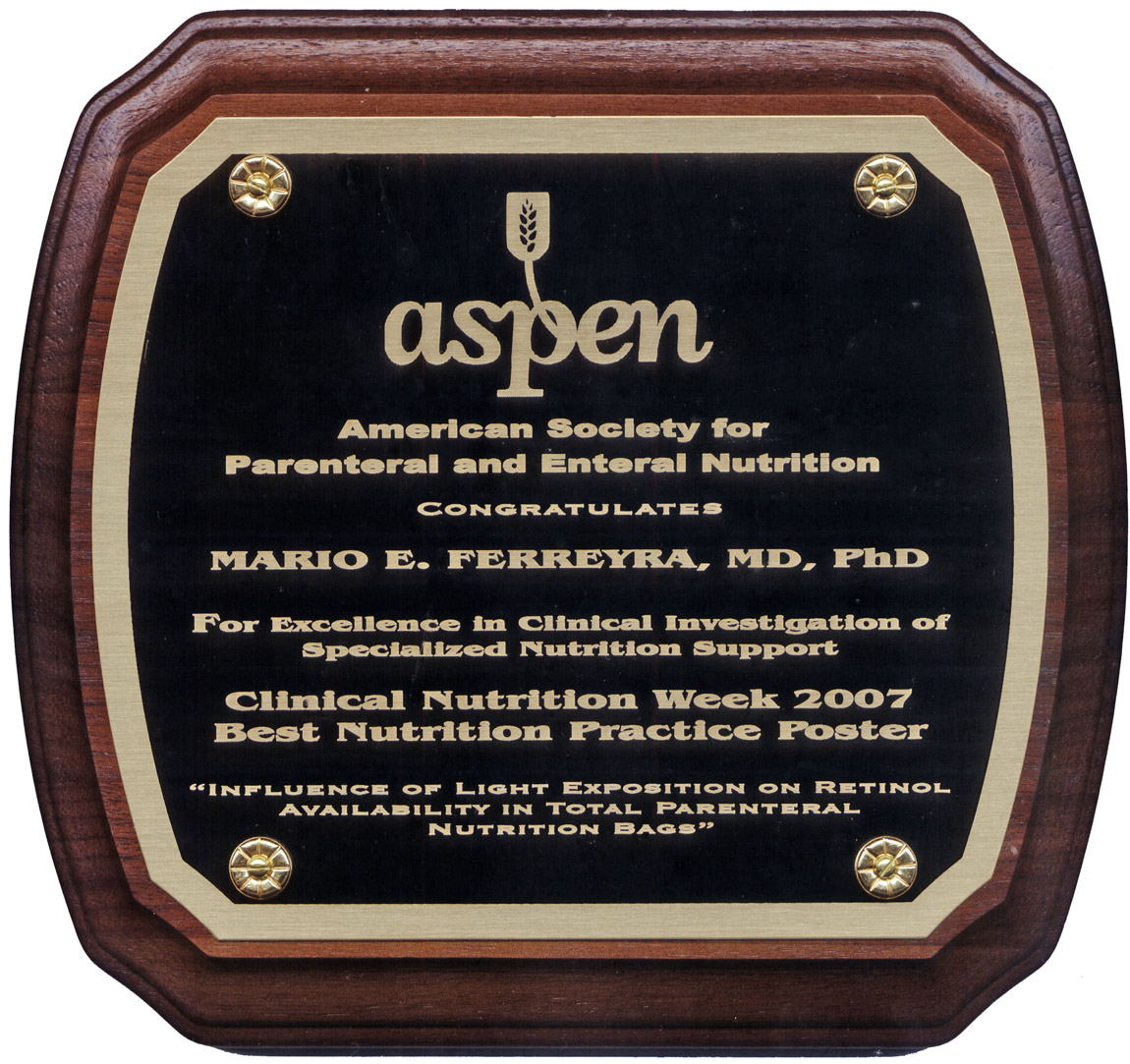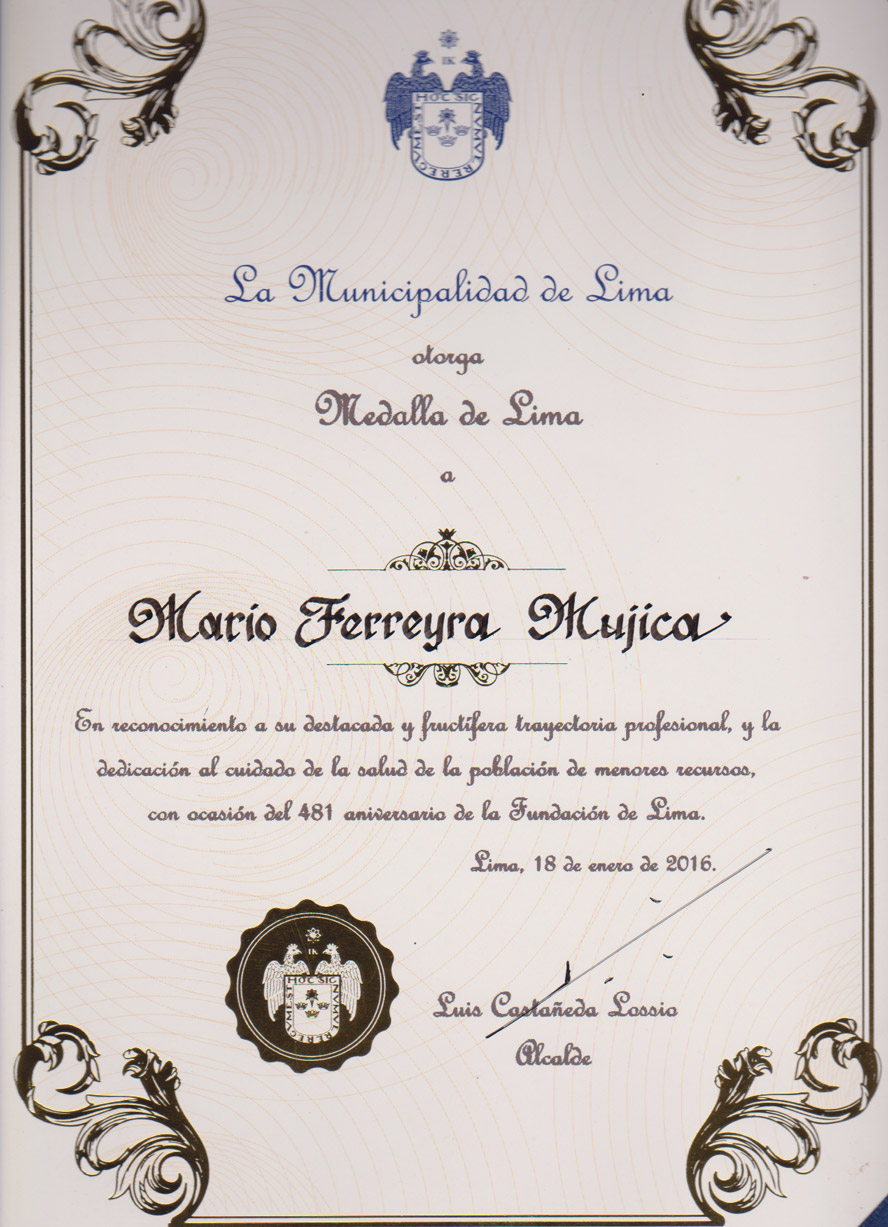 | Estas medallas fueron entregadas por los logros obtenidos en base a la investigación sobre soporte nutricional farmacológico en el Perú. Entre los trabajos de investigación nacionales e internacionales, destaca el artículo Criterios de Calidad Farmacológica en el Soporte Nutricional Artificial aplicados al Perú. Rev. GastroEnt Perú. 1996; 16:106. Dicha publicación desnuda la farsa de la pseudonutrición parenteral, que reinó en el Perú por mas de 20 años en el Seguro Social y en todo medio público y privado del país. | |